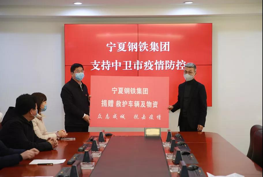 1月28日,寧夏鋼鐵集團(tuán)向中衛(wèi)市捐贈(zèng)了價(jià)值200萬(wàn)元的4輛救護(hù)車(chē)及600套鋪蓋、55臺(tái)電暖氣、55個(gè)電熱水壺、6萬(wàn)元的方便面和礦泉水等物資,第一時(shí)間支援中衛(wèi)市新型冠狀病毒肺炎防控抗擊工作。